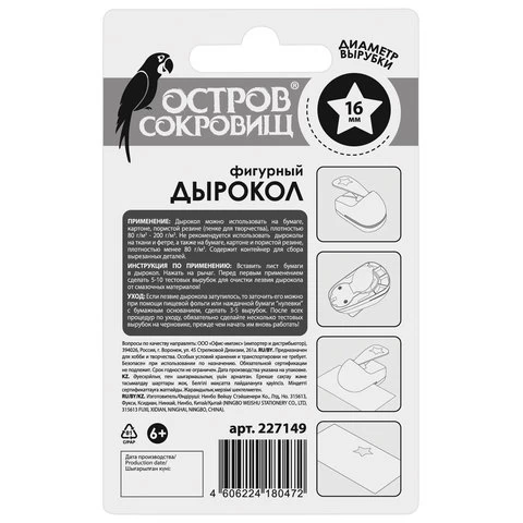 Дырокол компактный и удобный в применении, размер - 6х8,5х13,6 см. Диаметр пробиваемого отверстия - 16 мм, форма вырубки - звезда. Режущие части, изготовленные из высококачественного металла, защищены пластмассовым корпусом, что делает дырокол ОСТРОВ СОКРОВИЩ безопасным для детей. Дыроколом можно работать по бумаге, картону и пористой резине плотностью от 80 до 200 г/м2.