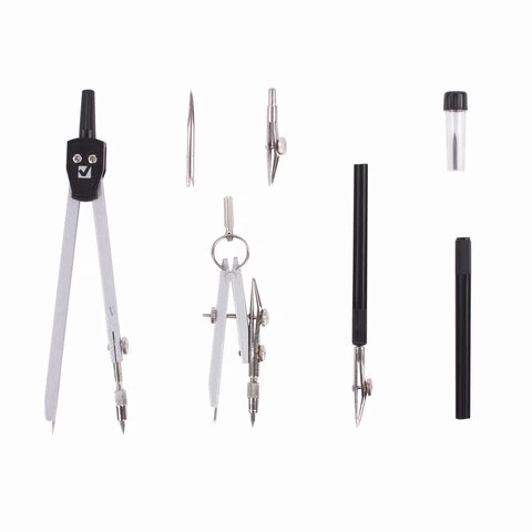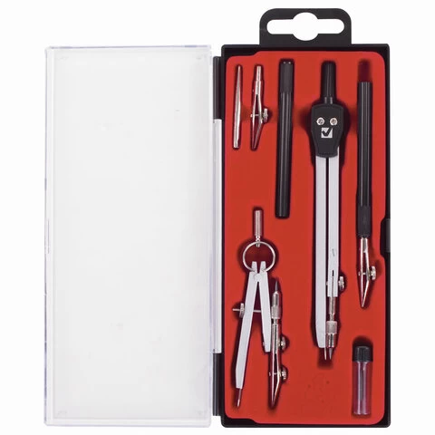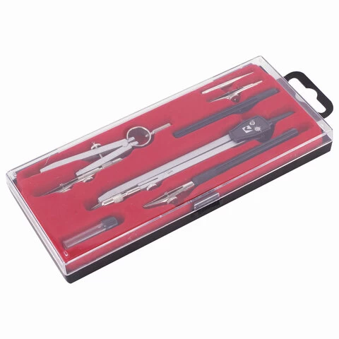 Комплектация: игольная вставка, кронциркуль, пенал с запасным грифелем, рейсфедер, рейсфедерная вставка и держатель, циркуль