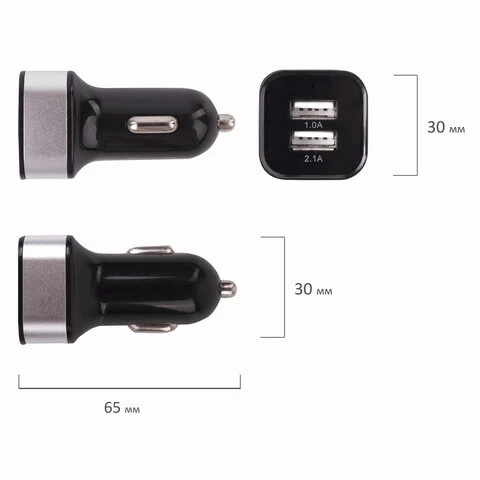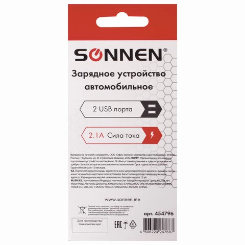 Зарядное устройство автомобильное SONNEN, 2 порта USB, выходной ток 2,1А, черное-белое, 454796