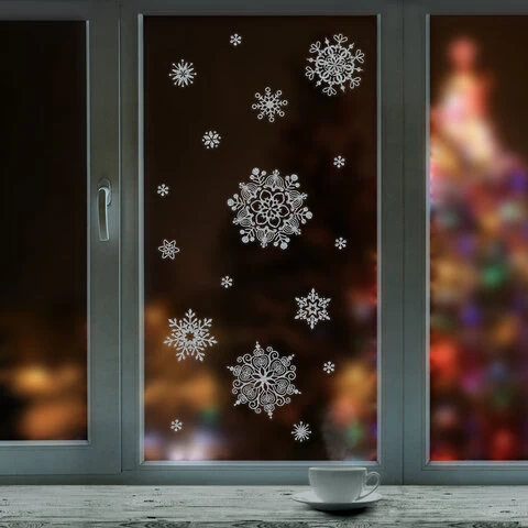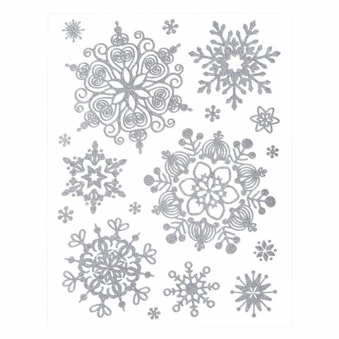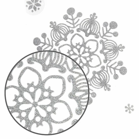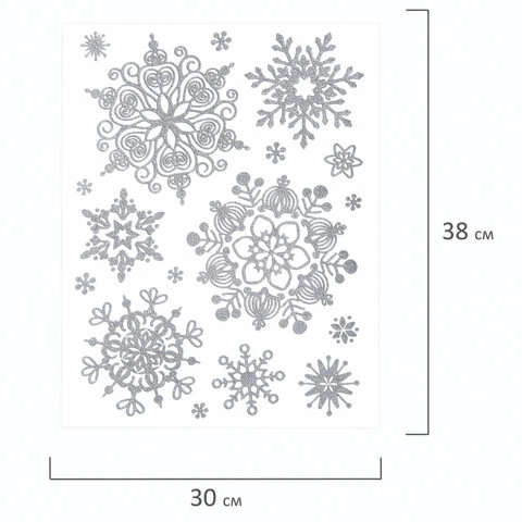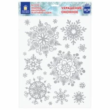 Изделие с изображением снежинок серебристого цвета представляет собой наклейку на окно/стекло, изготовленную из поливинилхлорида (ПВХ). Наклейка размером 30x38 см декорирована серебристым глиттером. Украшение предназначено для декорирования окон, зеркал, стекол и других ламинированных глянцевых поверхностей. Не оставляет клеевых следов и предназначено для многократного использования. Крепится к поверхности посредством статического эффекта. Украшение на белой картонной подложке упаковано в прозрачный полипропиленовый пакет на картонном подвесе.