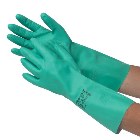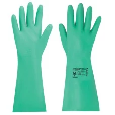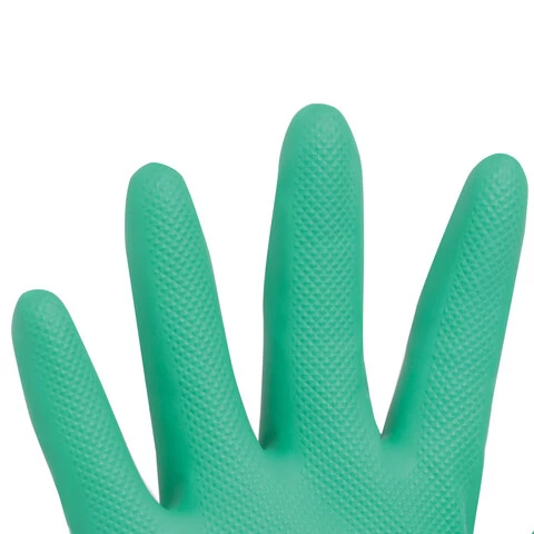 Надежное удержание скользких предметов благодаря рельефной текстуре. Перчатки толщиной 0,38 мм выполнены в зеленом цвете. Также могут применяться в пищевой промышленности. Имеют подкладку с хлопковым напылением. Длина - 330 мм.
