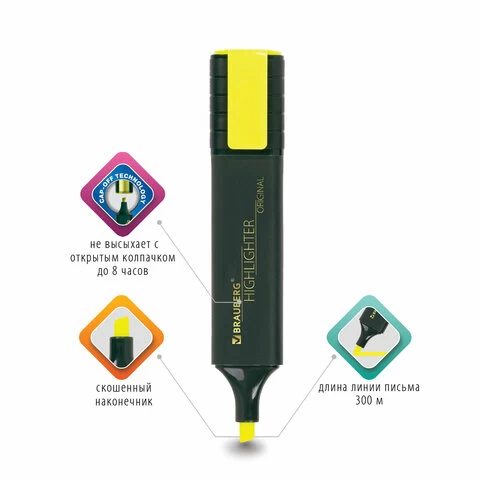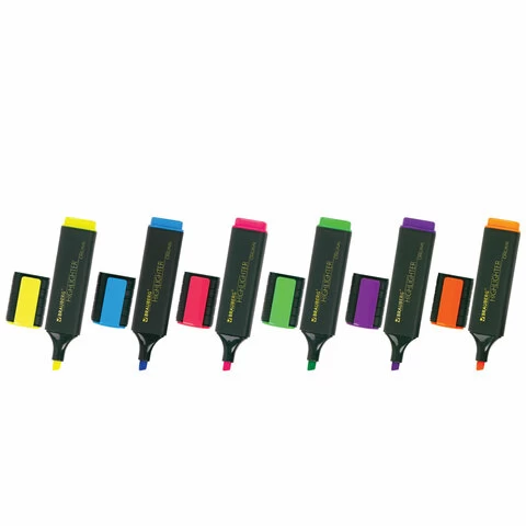 В наборе шесть неоновых цветов: желтый, зеленый, голубой, розовый, оранжевый, фиолетовый. Плоская форма корпуса, диаметр которого 25 мм. Скошенный наконечник имеет толщину линии письма от 1 до 5 мм, что обеспечивает удобство при работе с текстом, напечатанным мелким шрифтом, или таблицами. Благодаря особой водной основе чернил текстовыделители не высыхают без колпачка в течение 8 часов. Текстовыделители обладают экономным расходом чернил, при этом длина линии письма достигает 300 метров. Чернила быстро впитываются и тем самым предотвращают размазывание в процессе использования. Светоустойчивые чернила не выцветают даже на открытом солнце. Цвет клипа соответствует цвету чернил.