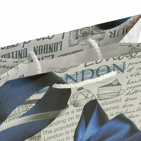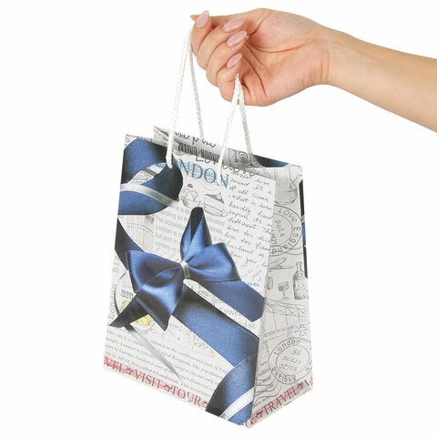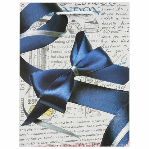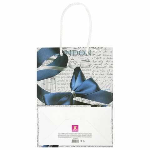 Изготовлен из ламинированной мелованной бумаги с веревочными ручками из полипропилена. Размер 17,8x9,8x22,9 см. Пакет выполнен в белых и серых тонах с изображением синего банта.