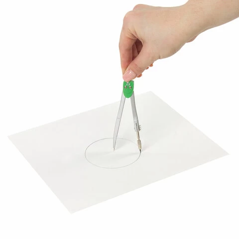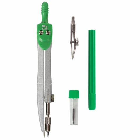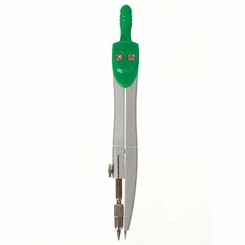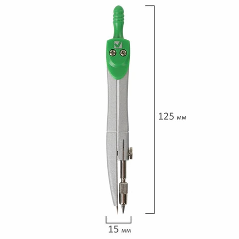 Циркуль длиной 125 мм имеет несгибаемые штанги. Изготовлен из металла, дополнительный цвет элементов - зеленый.