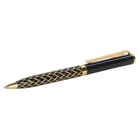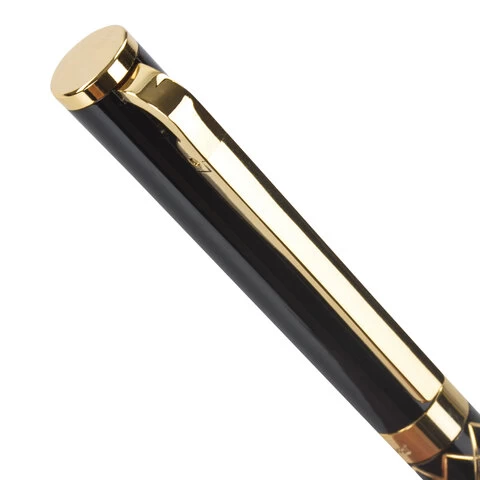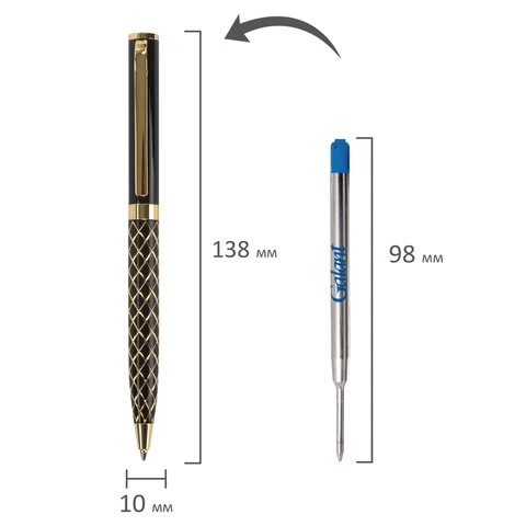 Корпус ручки черного цвета выполнен из латуни и декорирован позолоченными деталями. Синий цвет чернил, длина стержня составляет 98 мм, а диаметр пишущего узла - 0,7 мм. Поставляется в индивидуальном подарочном футляре. Подходит для гравировки.
